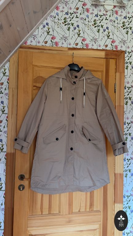 Mantelil on üks nööp ja lõdva lõikega siluett. Suurus 46-48. Rinnusuurus kuni 120 cm, pikkus 90 cm, varrukad 50 cm. Mugav ja kerge.