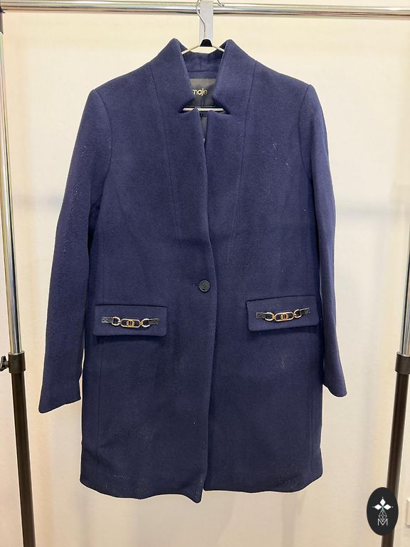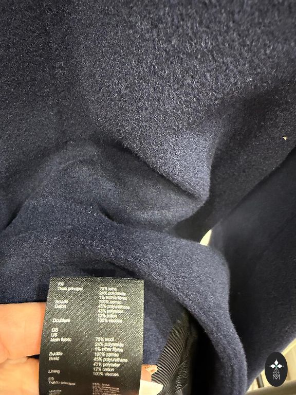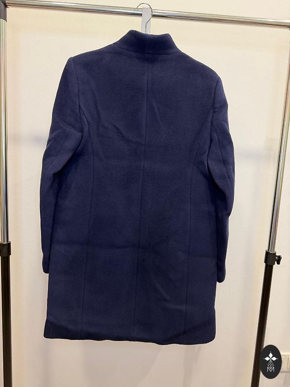 Новый, не ношенный. Состав: 50% шерсть и 50% полиэстер. На пальто указан размер 42, что соответствует размеру S или небольшому размеру M. Застегивается только на пояс, длина пальто 88 см, обхват груди около 110 см.