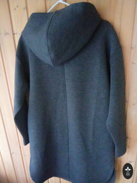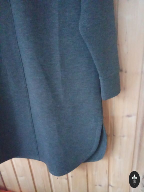 Яркий цвет. Бархатистый (не бархат) мягкий. Внизу резинка. Длина 65. Под мышками 52. Если расстегнуть кнопку, 55 см, полиэстер с эластаном.