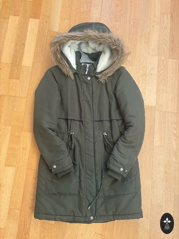 В отличном состоянии, теплая осенняя/зимняя куртка, длина 80 см, рукав 59 см. Можно стирать в стиральной машине. На капюшоне есть пристегивающийся искусственный мех. Размер S.