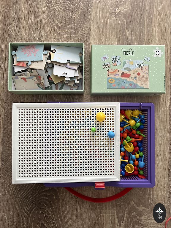Очень качественные пластиковые вставки, удобно держать маленькими ручками и легко надевать. Можно носить с собой как чемодан, ставить вертикально в специальное углубление и также горизонтально. Все части. Такую игру рекомендуют эксперты по играм и развитию детей из компании lovevery, которая следует принципам Монтессори. Игралась один раз несколько раз, коробка не совсем новая.