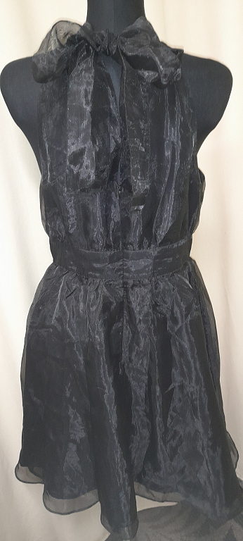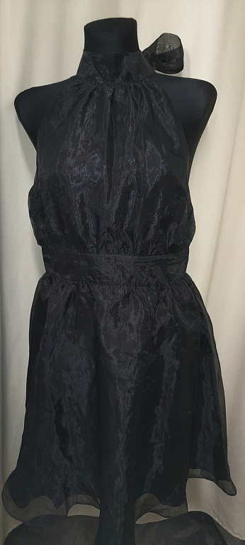 Labai graži, storo audinio suknelė su trumpomis rankovėmis. Dėvėta vieną kartą vestuvėse. Ilgis nuo peties 87 cm. Krūtinės apimtis apie 90-92 cm. Gale paslėptas užtrauktukas. Be pamušalo.