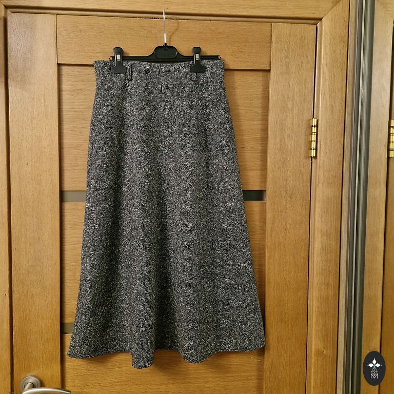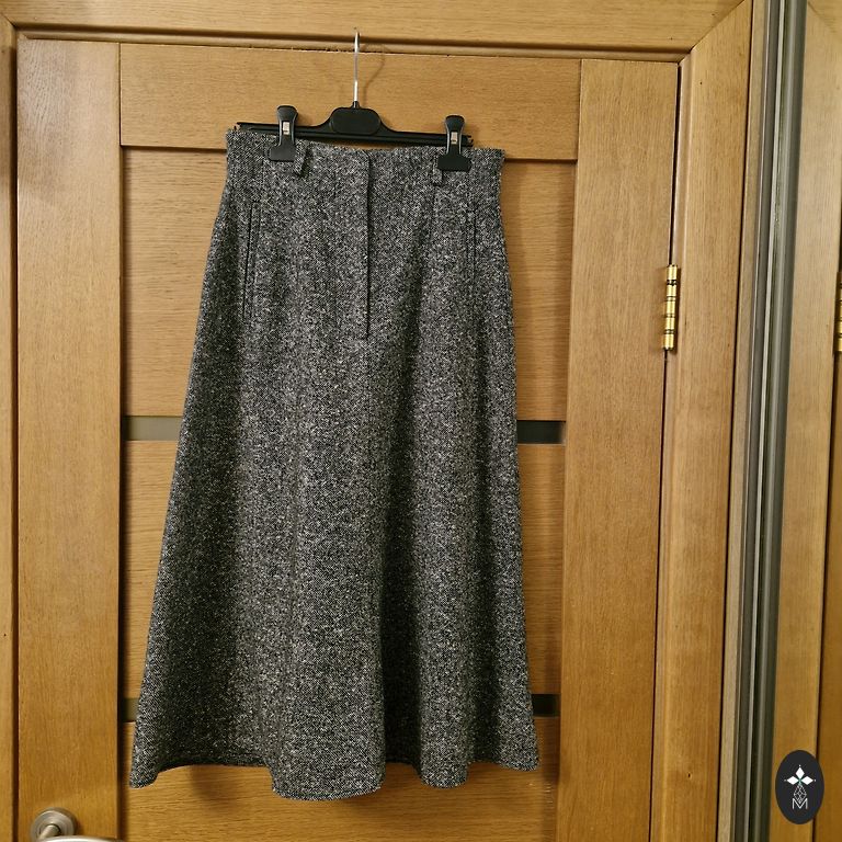 Gražus akcentas su lengvu laivelio formos kaklo iškirpimu ir fantastiškai gražiomis plačiomis rankovėmis su kritimu. Ilgas užtrauktukas, plyšys nugaroje.