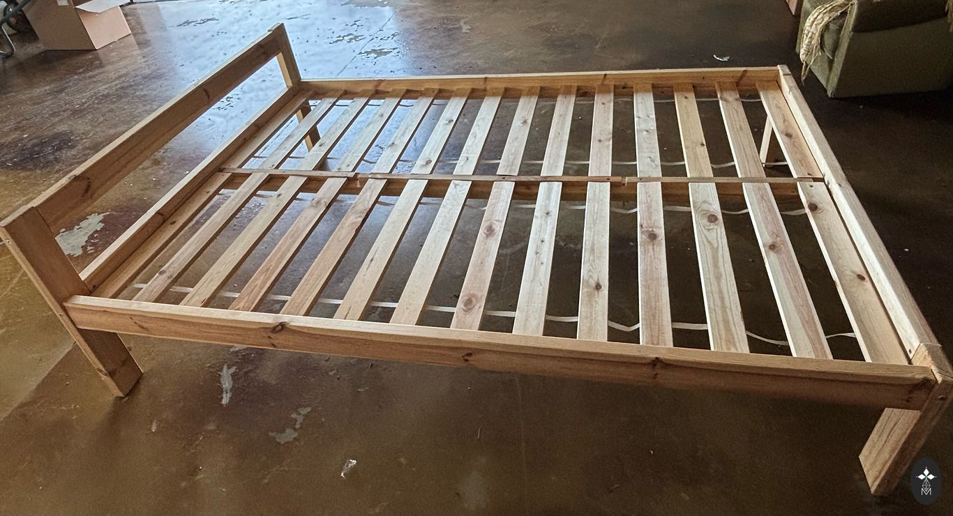 The bed is used but in very good condition. Does not squeak. The material is glued solid wood - does not warp and does not absorb moisture. Will serve for years to come. Made to order.