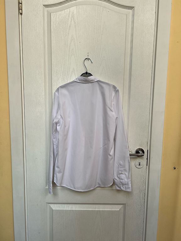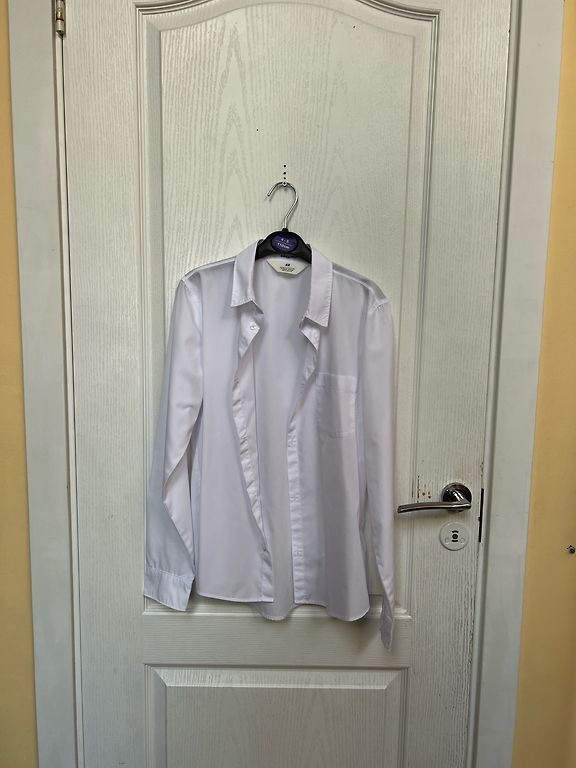 Selling three boys' long-sleeve shirts. Light blue - "Destination" brand (size 134), red - "Little kids" brand (size 134), blue - "H&M" brand (size 128).