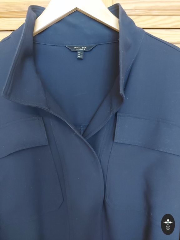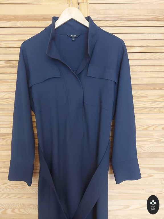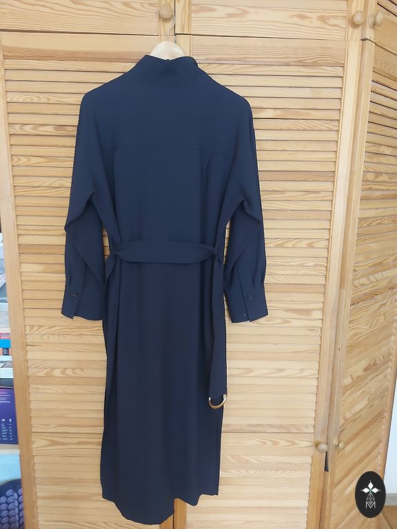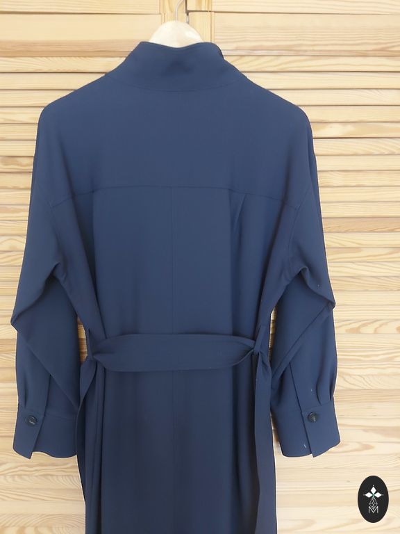 Straight-cut classic dress. Length 93 cm, width under the arms 48 cm, hips 50 cm. Elastic, non-wrinkling, deep dark blue tone. Suitable for size 36/38. Worn once, without use.