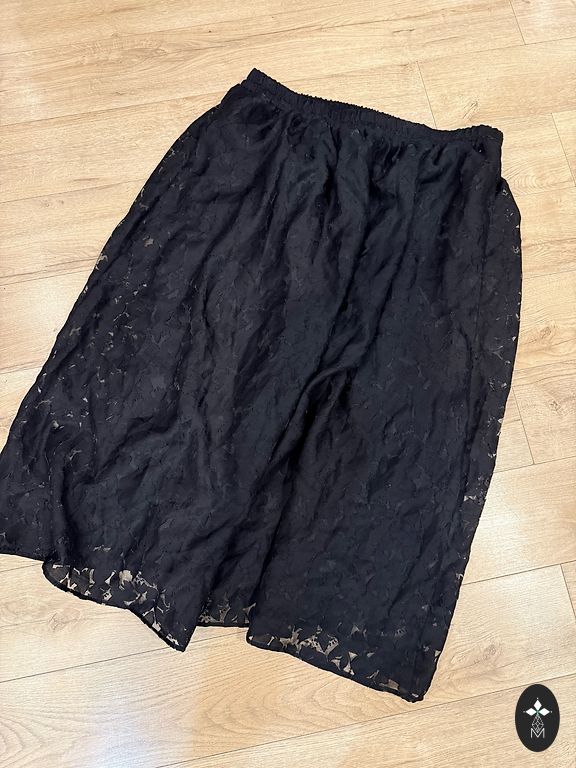 Super stiilne, ees loodetavasti topeltlukuga tõmblukk. Külgedel taskud, taga vöökohas kumm. Seelik on üsna elastne. Vööümbermõõt 100-110, puusad 170, pikkus 82.