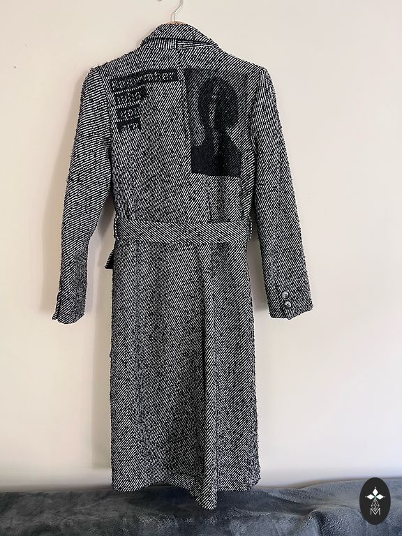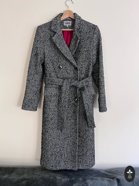 Label size is XS, but the coat fits S–M due to its oversized cut.