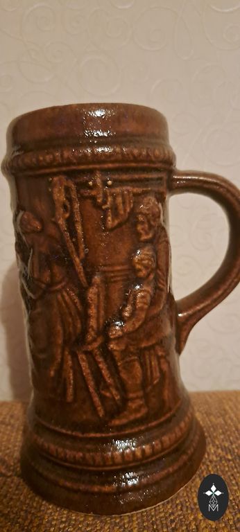 Senovinis keramikos kavos duetas (kavos duo): puodelis su lėkštute elegantiškoje spalvoje. Lėkštutės glazūra yra sodriai, tamsiai rudos spalvos. Puodelio išorė yra padengta tokia pačia tamsiai ruda glazūra ir trimis horizontaliomis juostelėmis, o kontrastinga, šviesiai žalia glazūra puodelio viduje. Rafinuota ir patogi puodelio forma, talpina 145 ml, jei kava pilama paliekant 1 cm iki puodelio viršaus. Indai turi labai subtilų įtrūkimų efektą glazūroje.