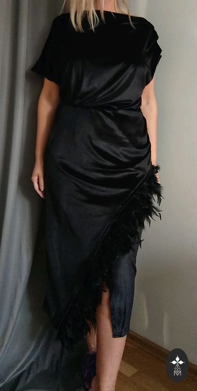 Kleitiņa ar spalvu akcentu. Labi derēs gan M,gan L izmēam.Krūtīs no 92-98, viduklī 75-80, gurnos brīvi no 98 līdz 106 cm