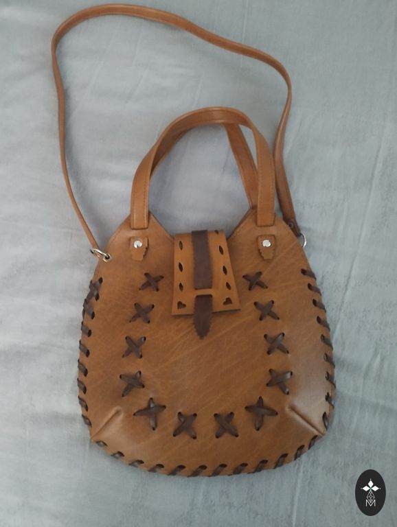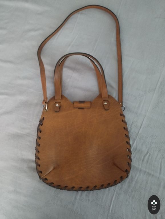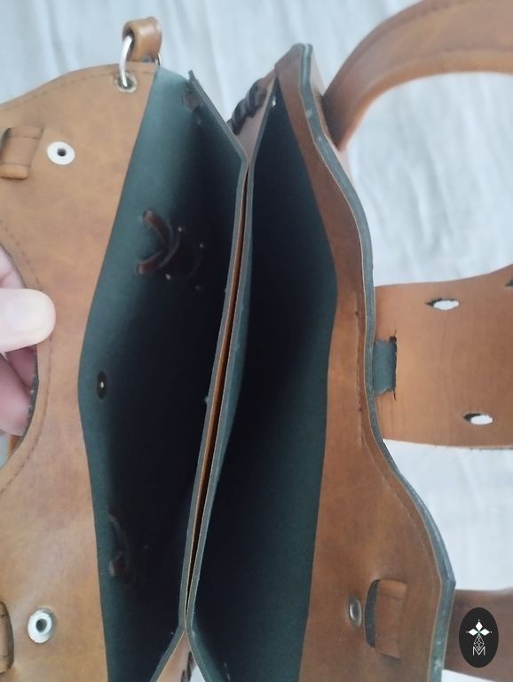 Somā no dabīgās ādas (mīksta āda). Ļoti ietilpīga. Siksna ir regulējama. Augstums 18,5 cm. Garums 31 cm.