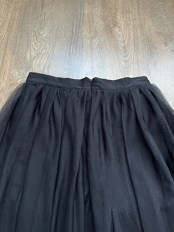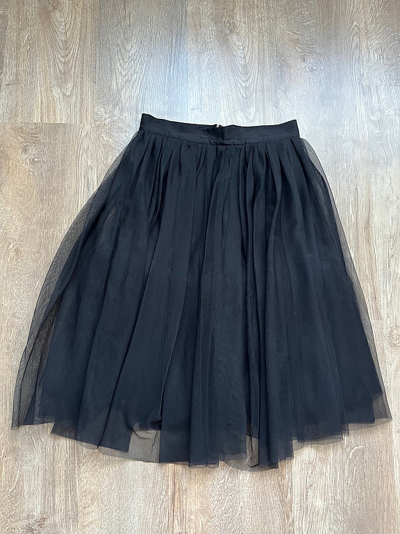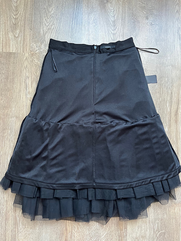 Norādīts 40/42.izm.(sk.manis norādītos mērus). Krītoši svārki ar šifona ielaidumiem,ļoti svinīgi izskatās. Piedod svārkiem intetesantu izskatu. Ir oderīte,aizmugurē rāvējslēdzis.
