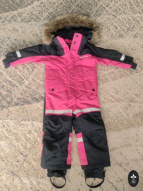 Selling Lassie winter suit, size 86, fits 86/92, warm. Used, shows signs of wear on the backside and knees, and a small stain on the front, but not very noticeable in the pattern, nothing is torn. Includes rubber bands, hood, and a separate fur piece for the hood is removable.