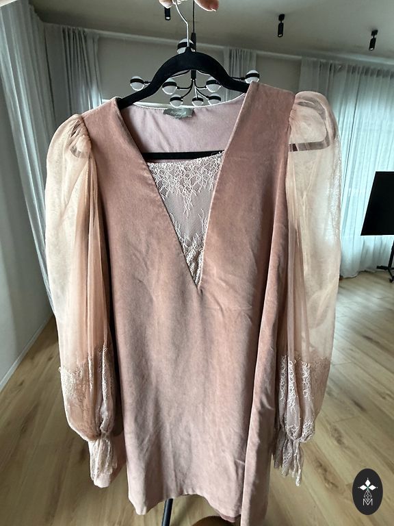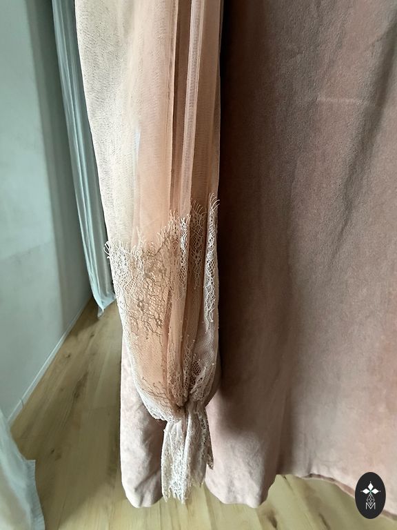 Išmatavimai: liemuo 38 cm, krūtinė 49 cm, klubai 53 cm, pečiai 41 cm (nuo vienos klostės iki kitos), suknelės ilgis 124 cm.