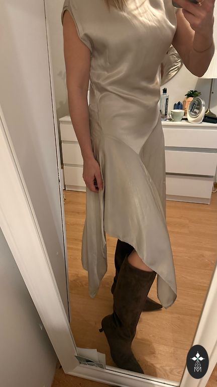 Cool festive dress! Very beautiful. Elegantly below the knee for a height of 160. The bust area is quite thick.