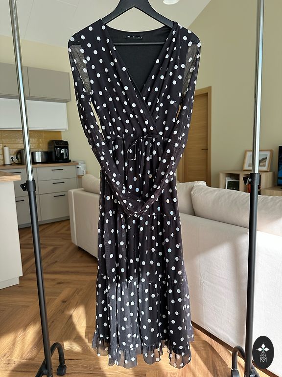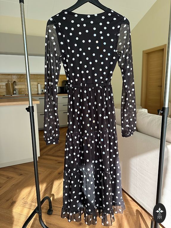 Pārdodas bez jostas.Ar asimetrisko apkakli. Garums 113 cm, viduklī 70cm.