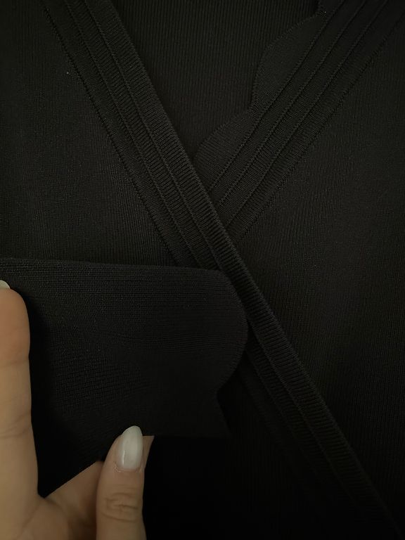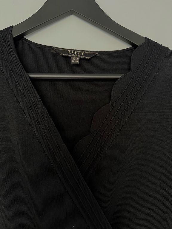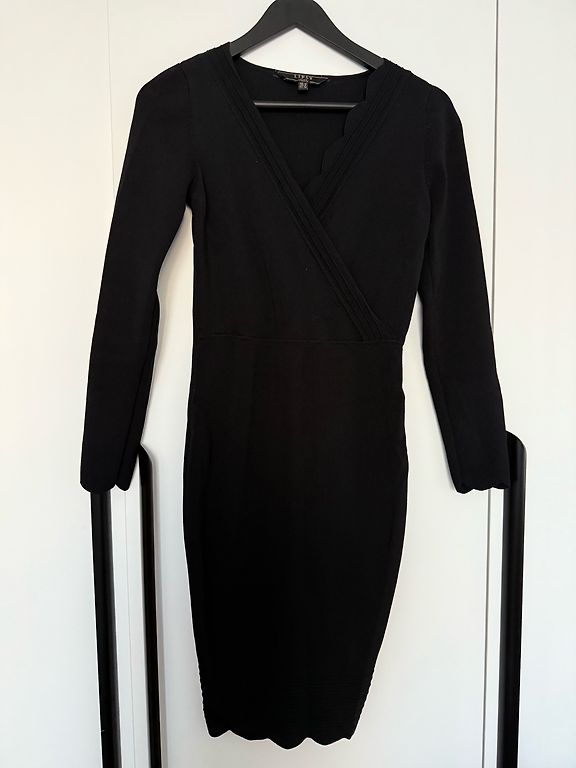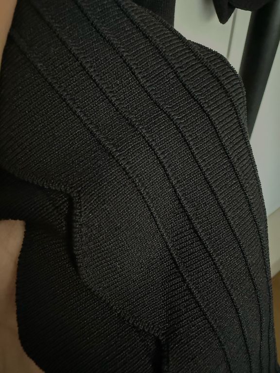 Parduodu kelis kartus dėvėtą elastinio audinio suknelę. Medžiaga: 53% nailonas, 35% acetatas, 8% metaliniai siūlai, 4% elastanas. Dydis etiketėje 14 UK/42 EU/10 USA. Ilgis 101 cm, plotis per pečius 44 cm, krūtinės apimtis 86 cm, liemens 80 cm, klubų apimtis 96 cm. Priekyje dekoratyvinis atlapas virš pagrindinio audinio. Suknelė yra iš elastinio audinio, todėl tiks ir L-XL dydžiams.