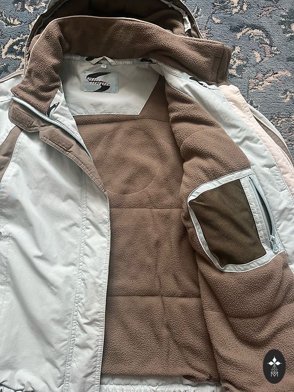 Куртка цвета хаки. Очень легкая и удобная. Слева немного поцарапан материал от сумки - видно на фото.