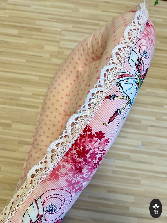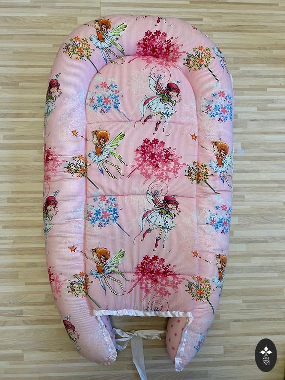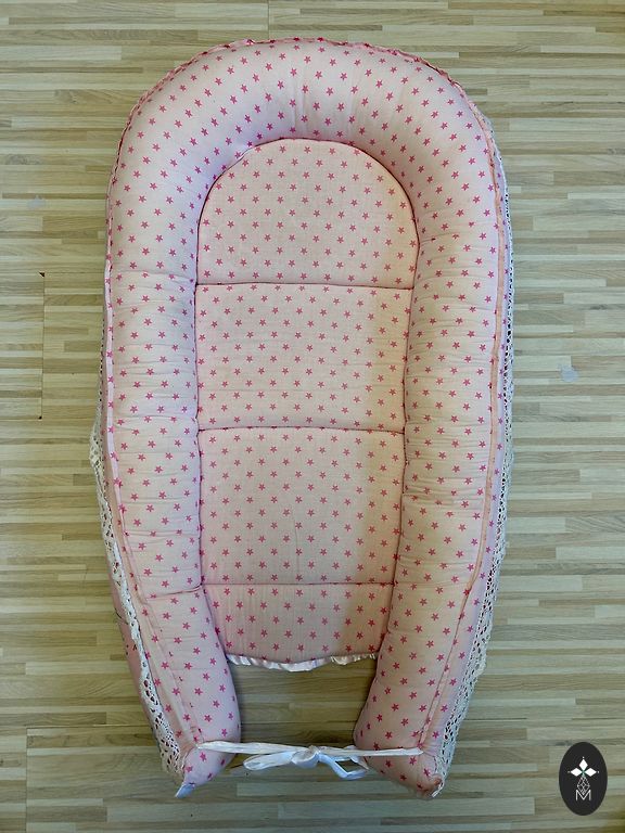 Милое гнездышко, очень полезное в первые месяцы жизни малыша. Небольшое, но не мешающее использованию повреждение - декоративная обертка вокруг веревки оторвалась, и когда хочется крепче завязать гнездышко, видна синяя веревочка (видно на фото). Без пятен и других повреждений. Находится в Смильтене.