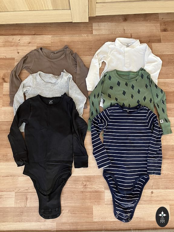 Very comfortable, soft cotton bodysuit. Front, middle section with buttons shirt, adjustable black bow tie. Slightly faded black color after washing. No stains or damage. Size 80.