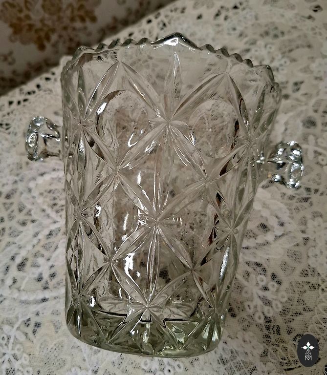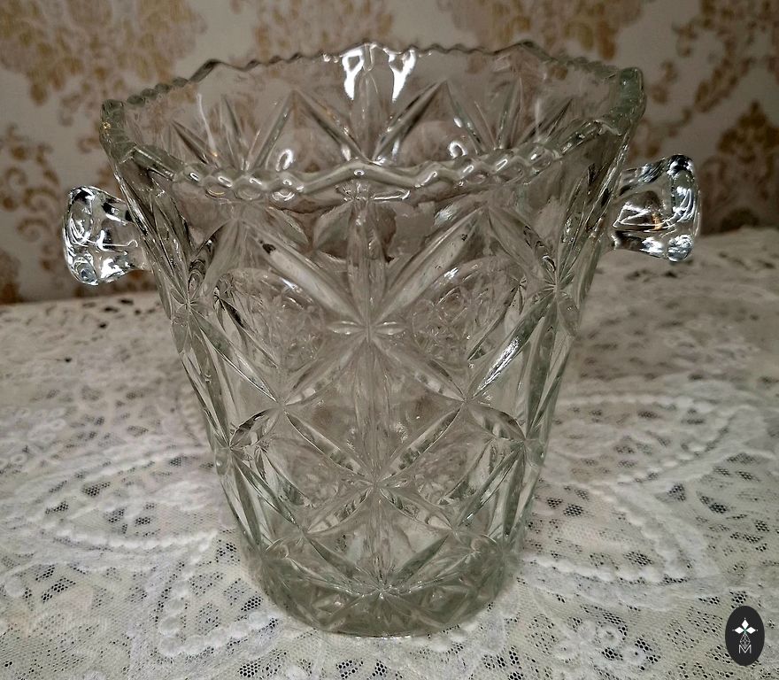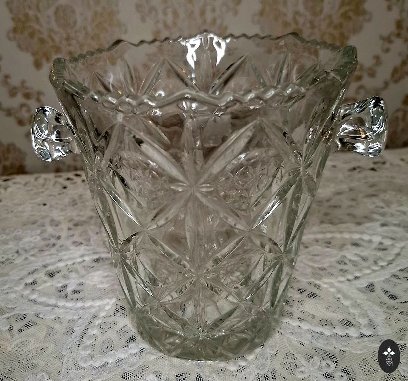 Paplāte ar skaistu rakstu, maza vāzīte un divas glāzes ideālā stāvoklī. Ar meistara roku gravējums no Padomju laikiem. Stāvēja aiz stikla.