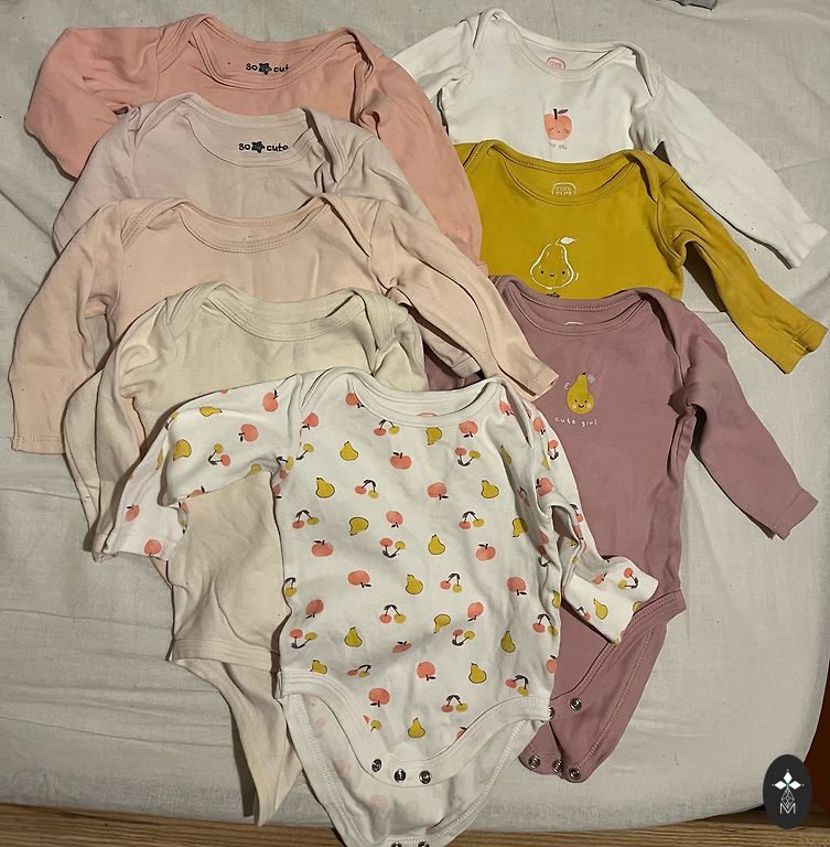 Everything from Lindex, bought new, worn by one baby, washed with baby powder. All size 68 - 2 long-sleeved bodysuits, 1 with short sleeves + 2 pants. Bodysuits with extensions, will fit longer. The pants with animals have insulation inside. The floral bodysuit has a small spot in the front, visible only upon close inspection, shown in the last two pictures.