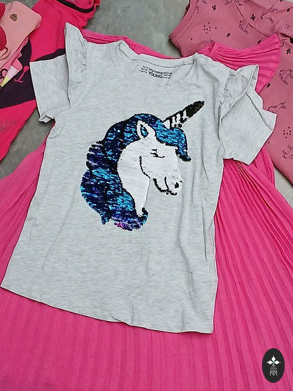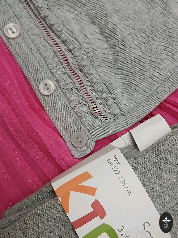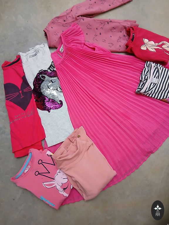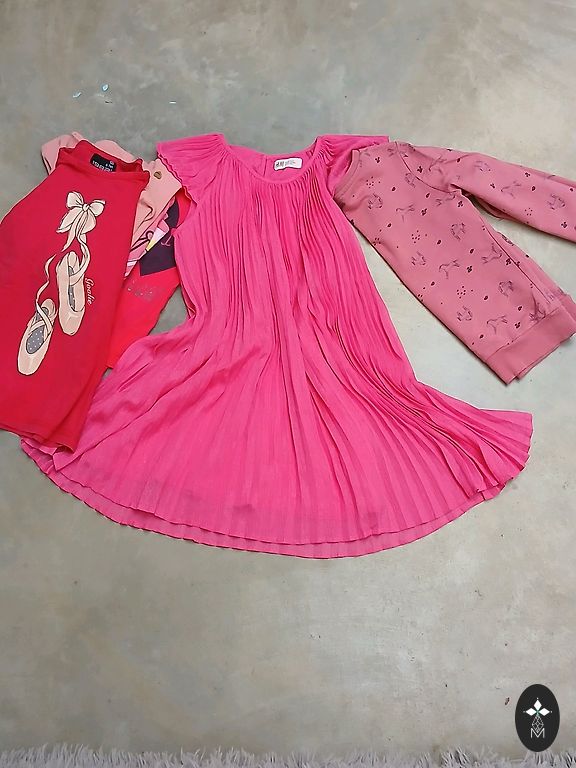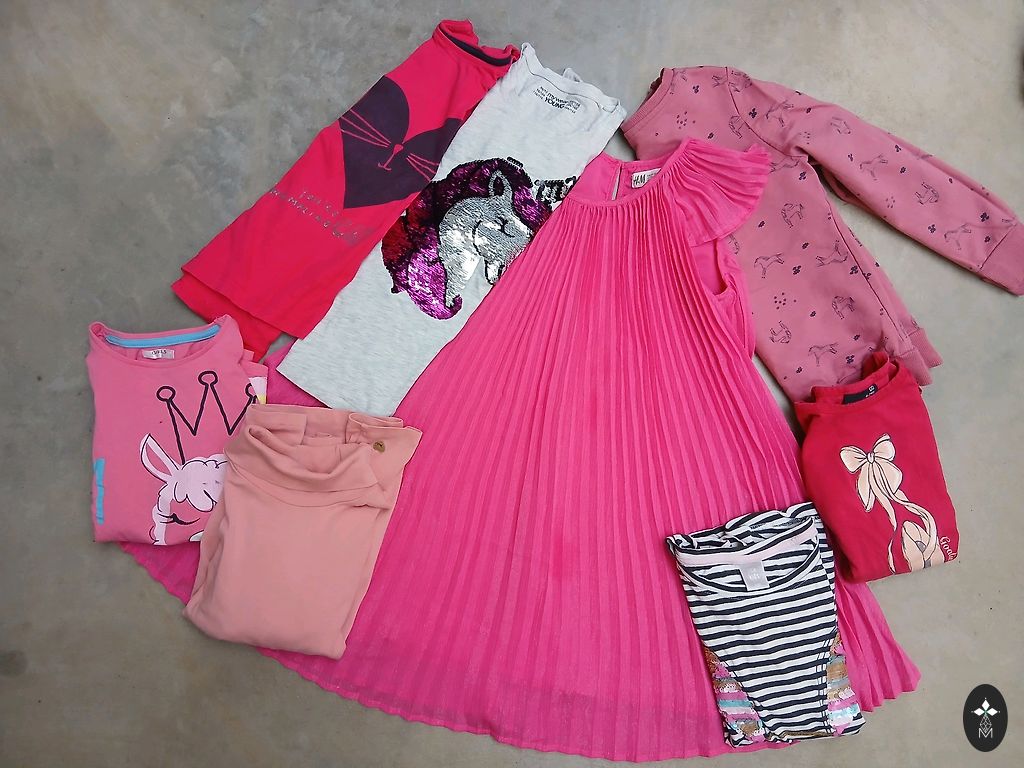 Uued riided, ei jõudnud selga panna, kasutatud on kleit südamekestega, pükskostüüm, lilla džemper. Kleit südamekestega, on väikesed kasutusjäljed, H&M, suurus 122/128; Lilla džemper, Sinsay, suurus 128 cm; Pükskostüüm, Sinsay, suurus 116 cm; Mustad retuusid, Sinsay, suurus 122 cm; Helged retuusid, H&M, suurus 128 cm; Roosad retuusid ja maasikatega, Sinsay, suurus 134 cm; Džemper maasikatega, Sinsay, 128 cm. Sukkpüksid, sokid uued.