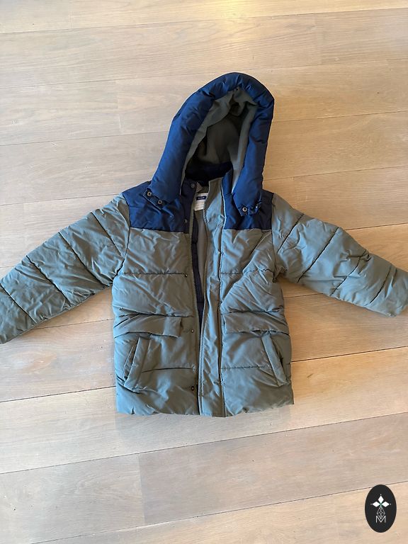 Ziemas jaka ar kapuci, 7–8 gadiem. Labā stāvoklī. Tikai vienai piedurknei ir nelieli aizķerumi no lipekļa