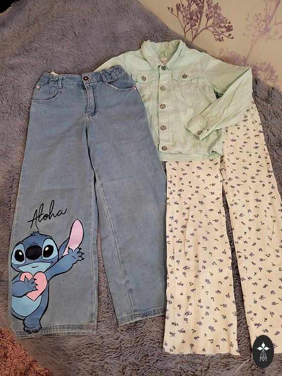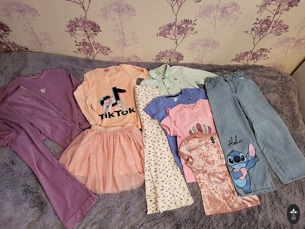 7 брюк, 1 джинсовый комбинезон, 3 летних платья, 3 платья с длинными рукавами, 1 сарафан, 1 праздничное платье, 3 боди с короткими рукавами, 5 боди с длинными рукавами, 3 простых футболки, 4 тонкие свитера, спортивный костюм, 2 блузки.