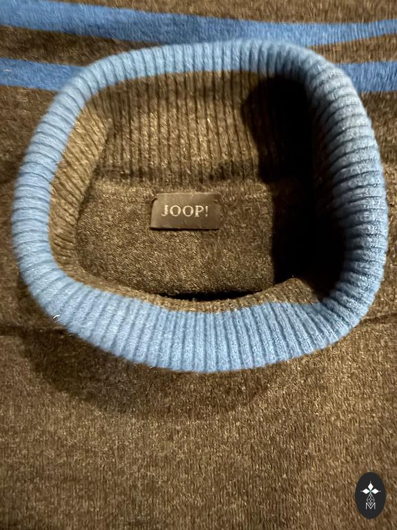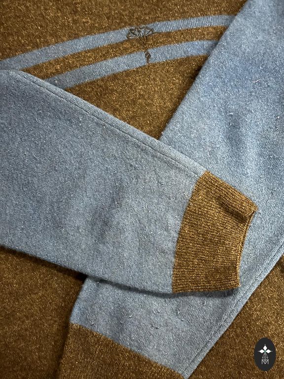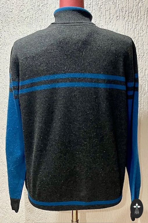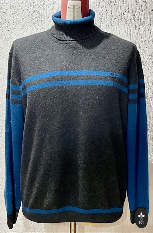 Elm brand warm, high-quality knitted sweater with a zipper and high collar. Beautiful Nordic pattern design in gray and bluish tones. Very suitable for winter. The sweater composition includes 38% wool, making it very warm.