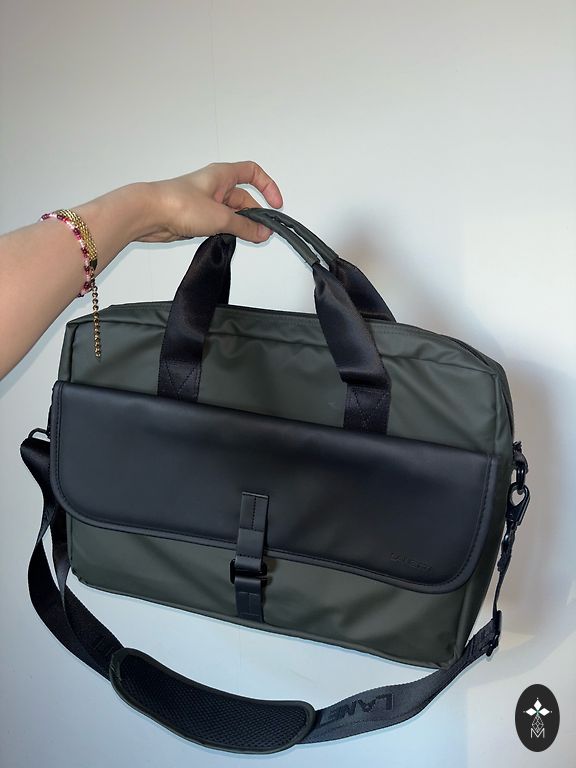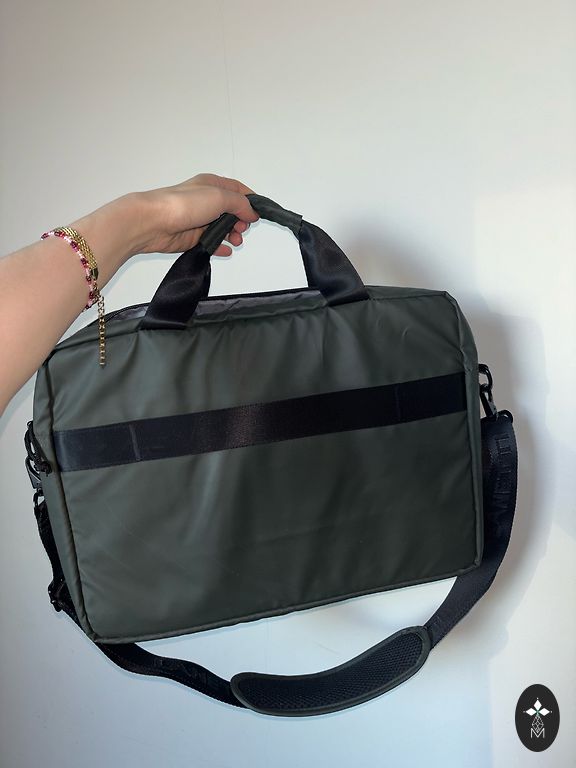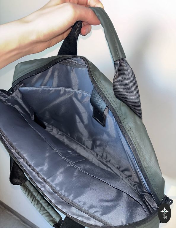 Soft and comfortable, worn on the shoulder. Fastened with a zipper. The only drawback is that the back has small lighter spots, which are hard to notice. Inside, there is one large compartment and small pockets. Outside, a pocket with a zipper. Dimensions 33-33-12.