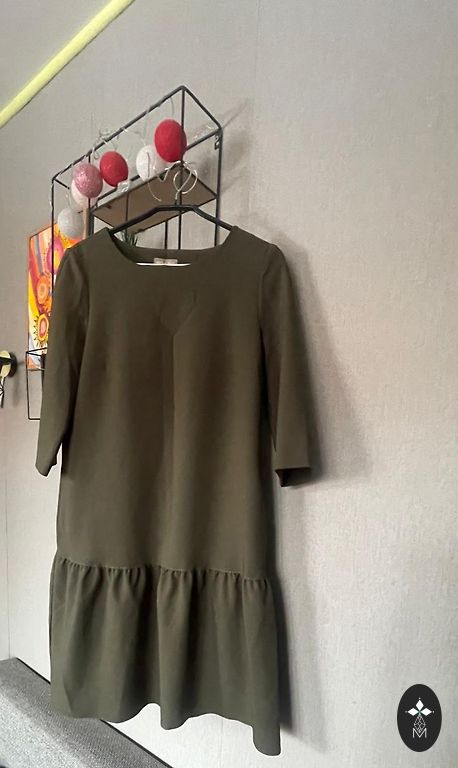Midi length (below the knee), brown with white dots, lightweight material, long sleeves, button at the back of the neck, size labeled L/XL, but also fits M(38) with more detailed questions or pictures - feel free to write privately ;)
