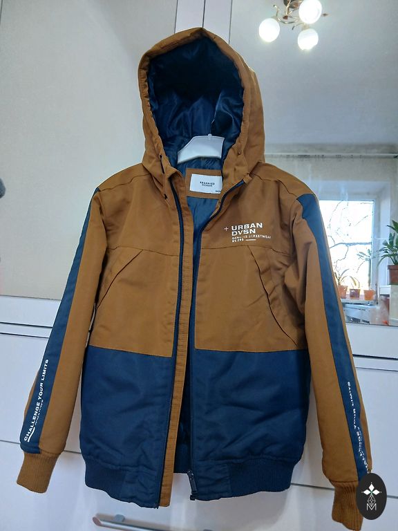 134 dydžio chaki spalvos pailginta šilta žieminė striukė su gobtuvu (su spaudėmis tvirtinama pūkuota apdaila). Krūtinės kišenė su užtrauktuku, vidinė kišenė ir šoninės kišenės su užtrauktukais. Šonuose apačioje užtrauktukai.