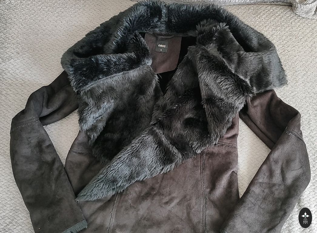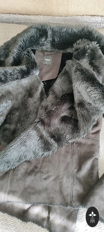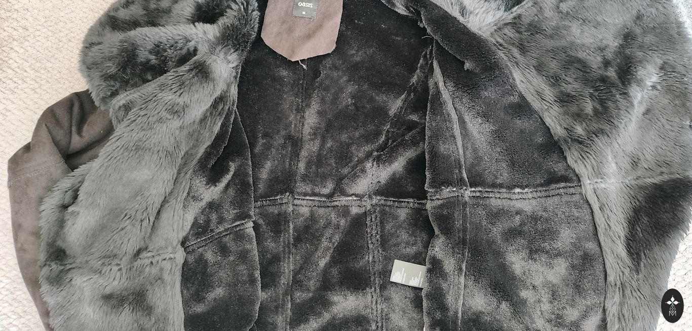 Viegls, mīksts, kažokādas puskažoks ar pogu aizdari un jostiņu, bez defektiem.