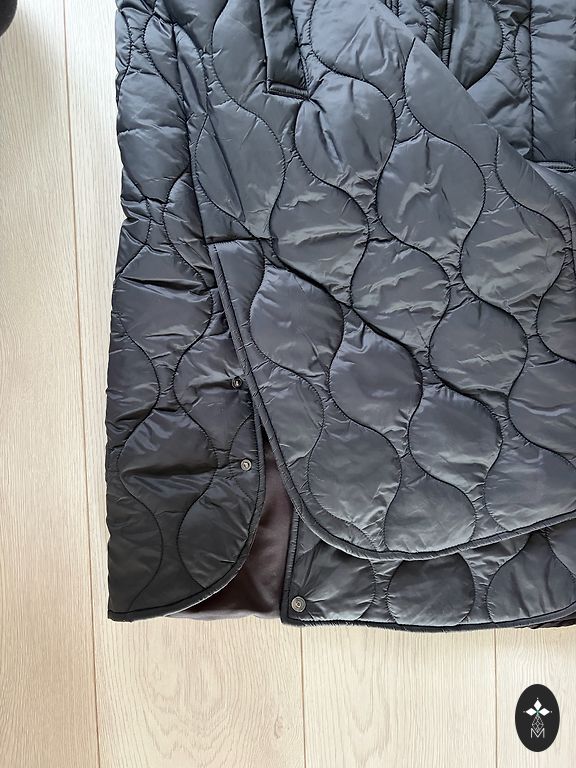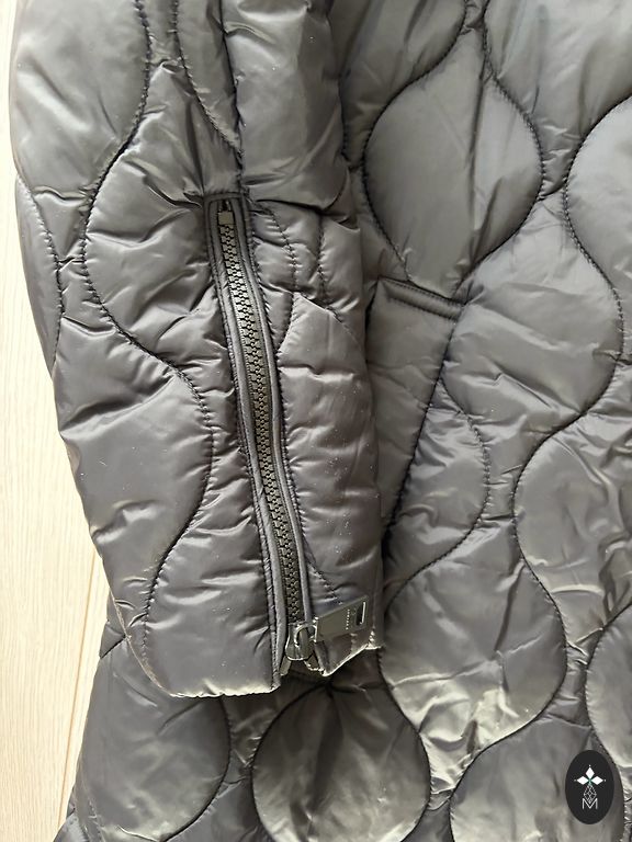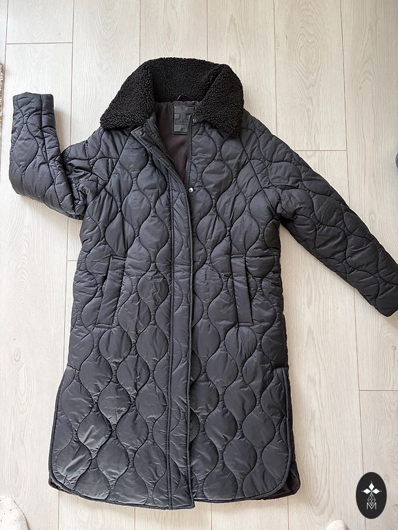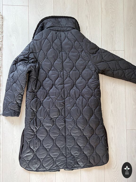 Būklė: naudotas, yra nusidėvėjimo požymių apykaklės zonoje (matoma nuotraukoje). Kitaip geros būklės. Krūtinė 98 cm, pečiai 41 cm, klubai 112 cm, rankovė 61 cm, ilgis 95 cm.
