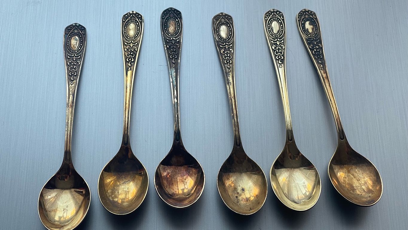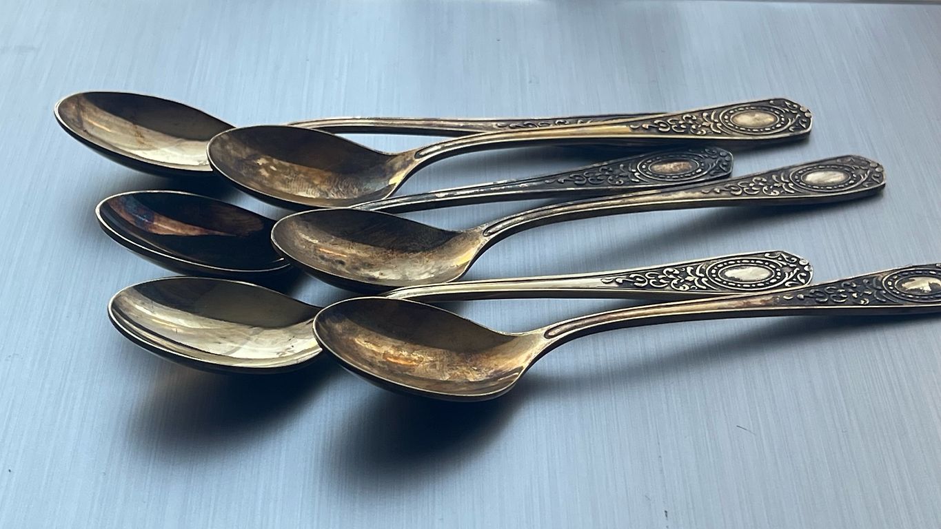 Красивый набор серебристых чайных ложек.