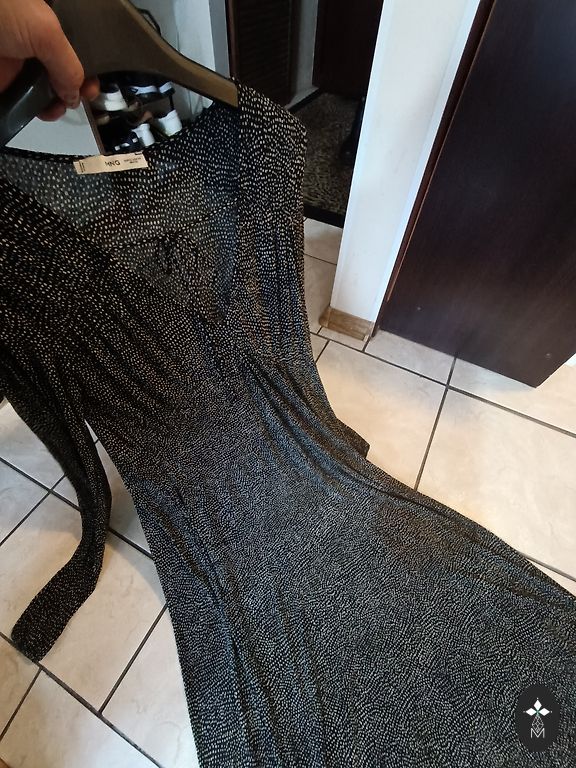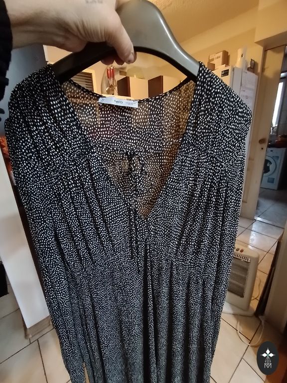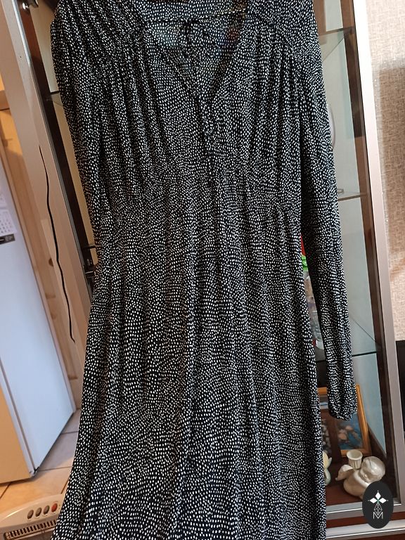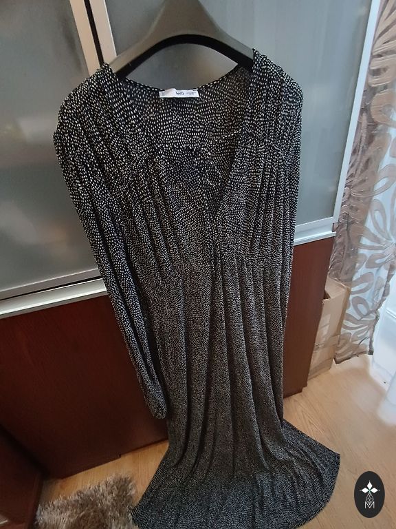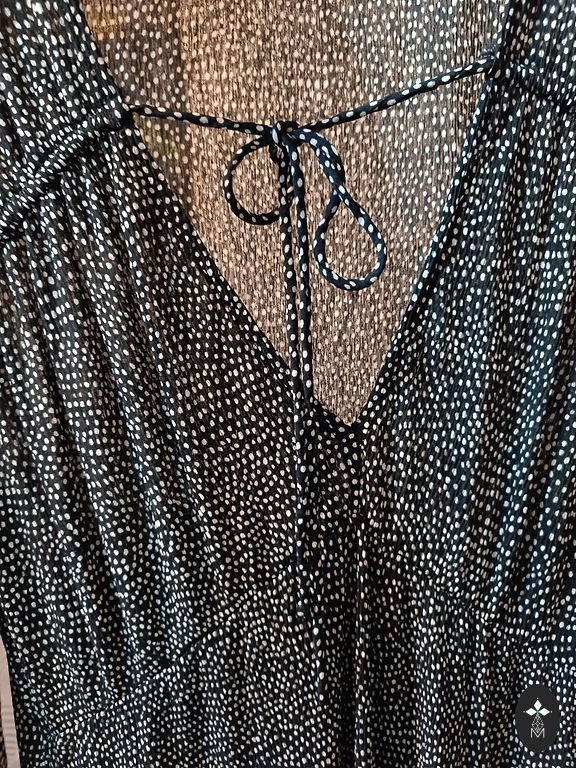 Very bright, beautifully falling ruffle dress. The waist on both sides can be tightened and tied with strings. Bust 116 cm, length 135 cm.