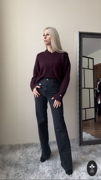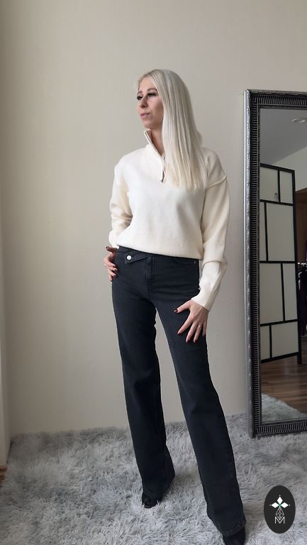 Šiltas, minkštas megztinis su aukšta apykakle. Sudėtis 40% vilnos – šiltas, bet malonus odai. Laisvas, patogus kirpimas, idealiai tinka sluoksniavimui: po švarku, paltu, liemene.