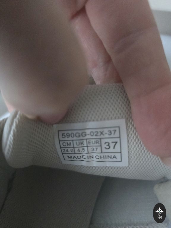 Указанный размер внутренней подошвы 22 см. Верх тканевый, светло-серый/бежевый. Подошва белая резиновая, розовая спереди, лиловая сзади.