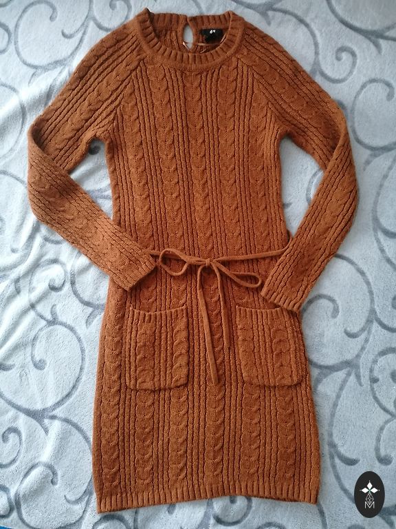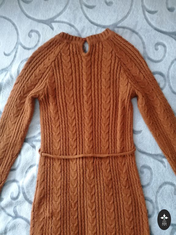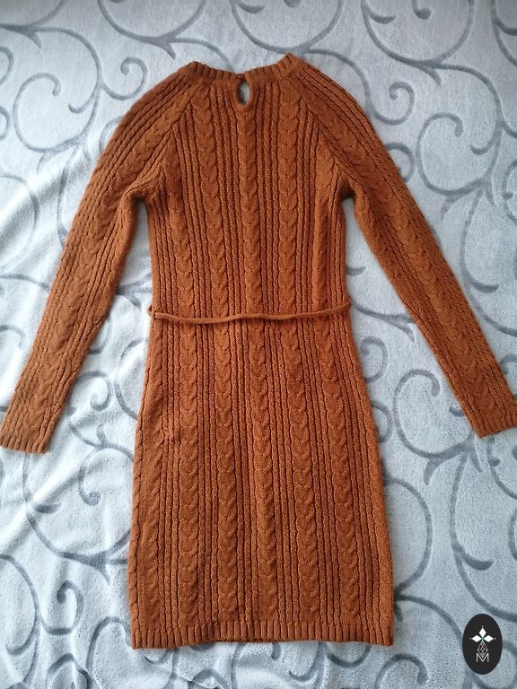 Smuka šokolādes krāsas trikotāžas mini kleita ar ielocēm. Svārki kupli uz leju. Izskatās lieliski visos gadalaikos. Nedaudz atgādina Sandro kleitu stilu. Trikotāža ir bieza, smaga, 51% viskoze un 49% poliamīds. Lielisks stāvoklis, kā jauna.