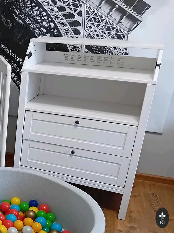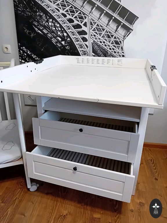 Pārtinamais galds ar plauktiem un groziņiem no IKEA GULLIVER sērijas. Lietots saudzīgi, vienīgā redzamā nepilnība ir kājiņa, kura atradās tuvāk dušai un ir mazliet ieplaisājusi krāsa no mitruma. Viss savādāk stabils, neļogās.