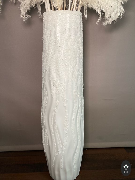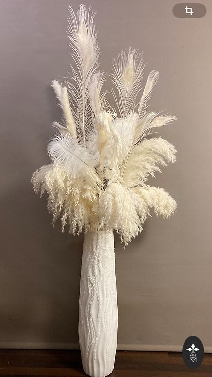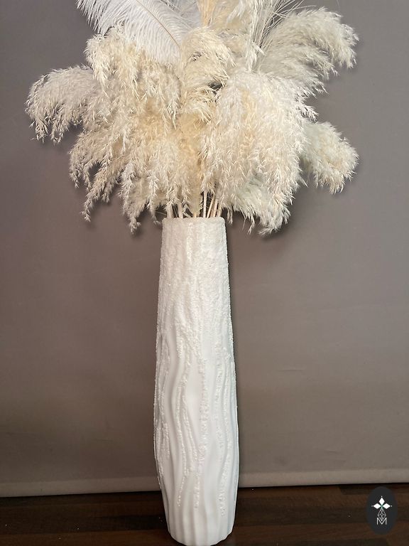 Plastikinė grindų vaza, dekoruota dekoratyviniu smėliu, dirbtiniais stručio ir povų plunksnomis, taip pat naudojami natūralūs pampasai. Papuoš ir sukurs jaukumą kambaryje, biure, salėje. Pačios vazos aukštis - 56 cm. Su sausais augalais maždaug 120 cm.
