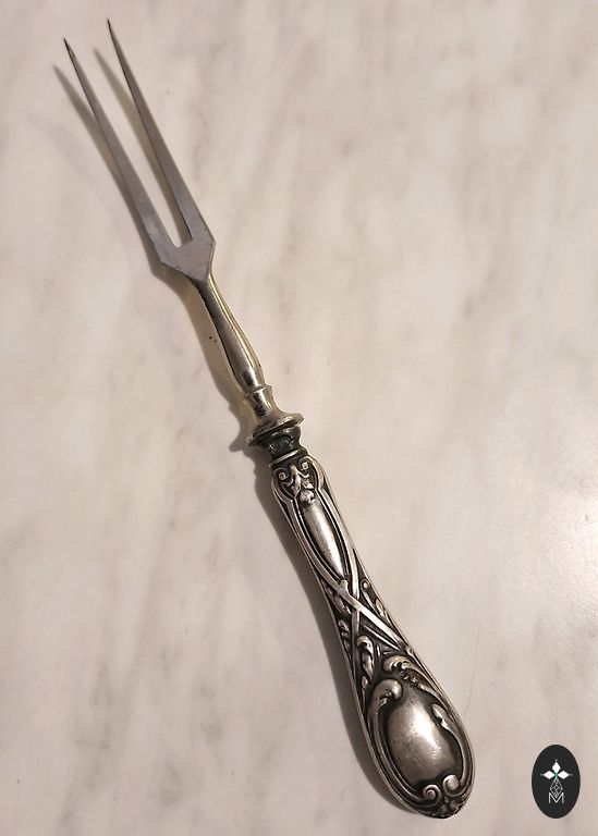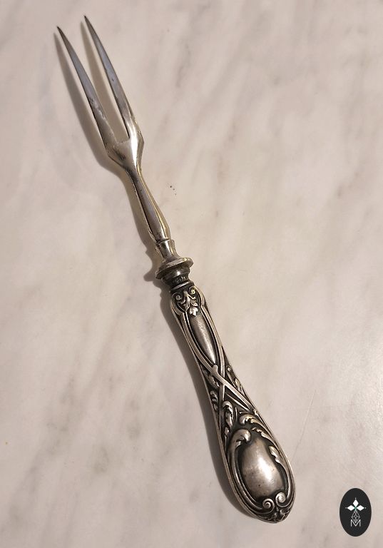 Siūlau retą ir autentišką antikvarinę sidabrinę šakutę su 875 prabos, pagamintą Rusijos imperijos laikotarpiu (XIX a. pabaiga – XX a. pradžia). Šakutės dantys yra originaliai paauksuoti, būdingi aukštesnės klasės stalo įrankiams. Rankena puošia subtilus, meninis ornamentas. Ant objekto išlikęs originalus antspaudas - 875 sidabro praba.