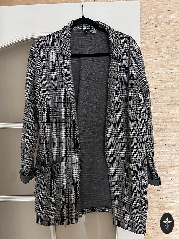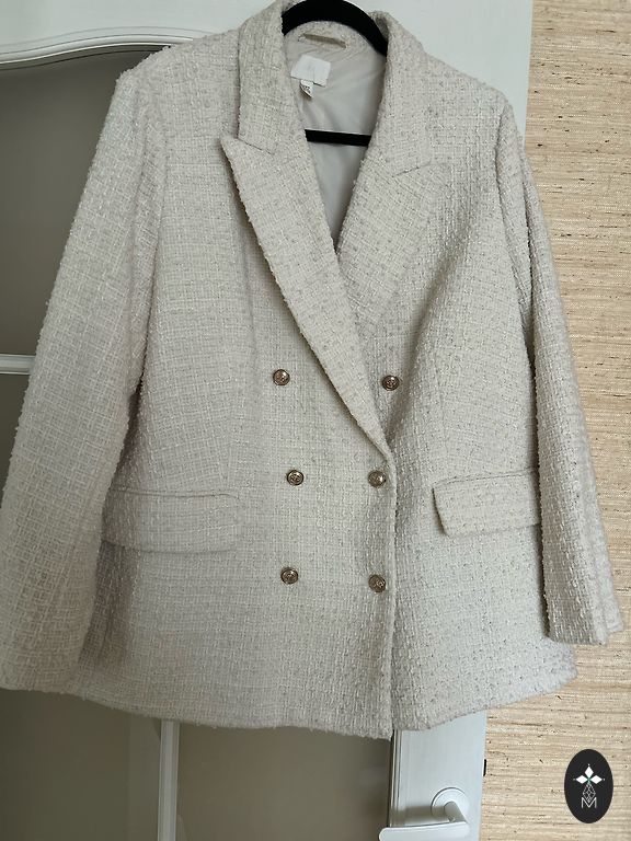 Ilus, valge, puuvillane lühike jakike voodriga. Kangas on tugev, hoiab vormi väga peene vahvelkanga mustriga. Jakil on ilusad õmblused. Rinnaümbermõõt 104, pikkus 62 cm.