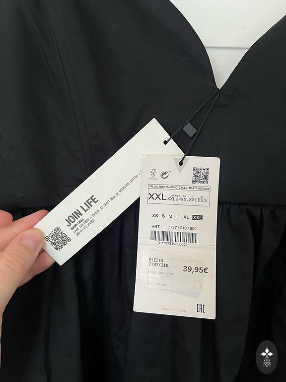 Dėl universalaus kirpimo jis tiks dydžiams nuo 40 iki 44. Juodas tiulis suteikia kostiumui paslaptingą eleganciją, o