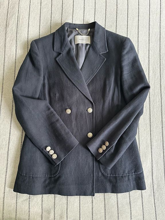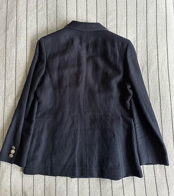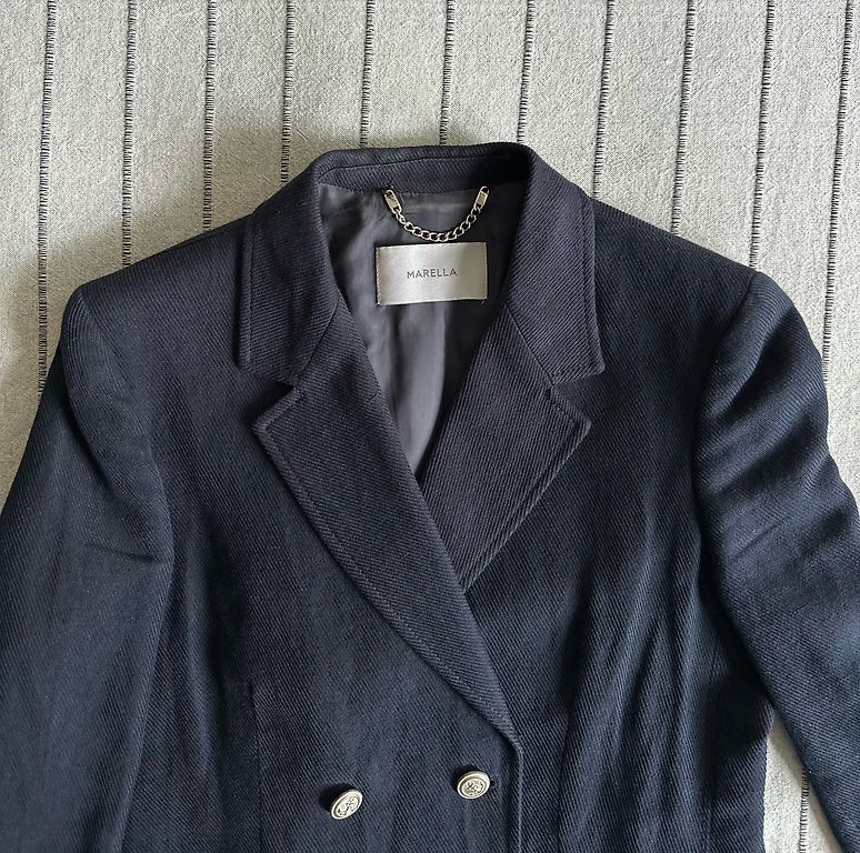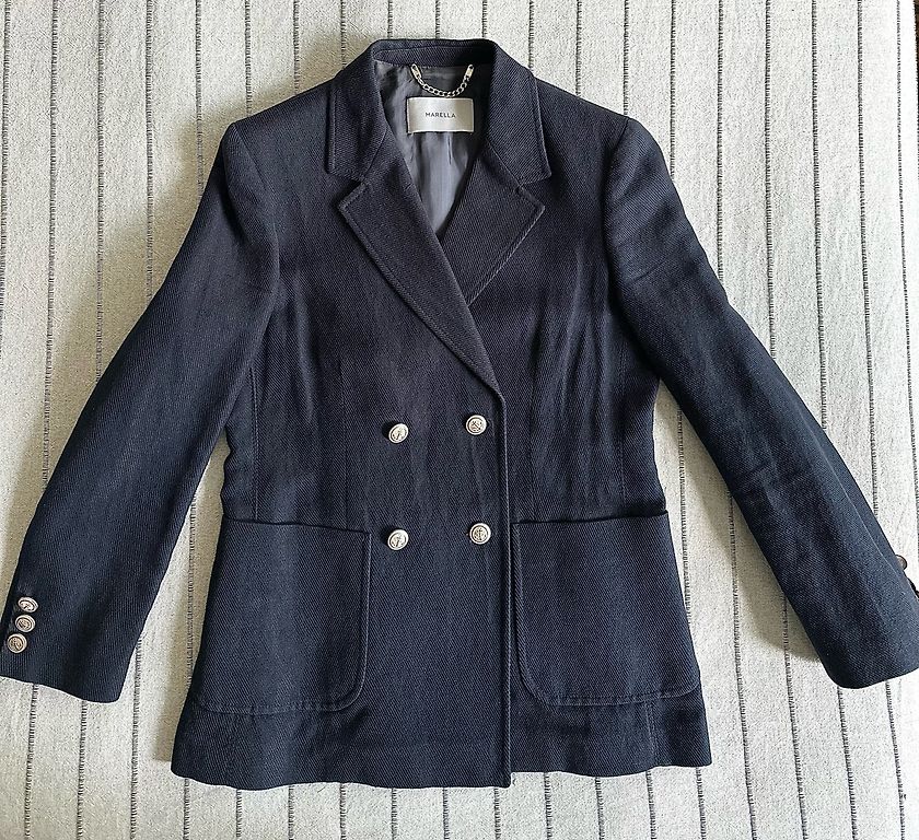 Серый пиджак с декоративной двойной застежкой.