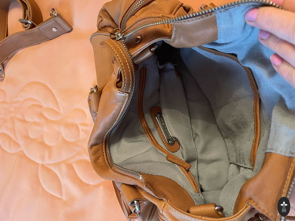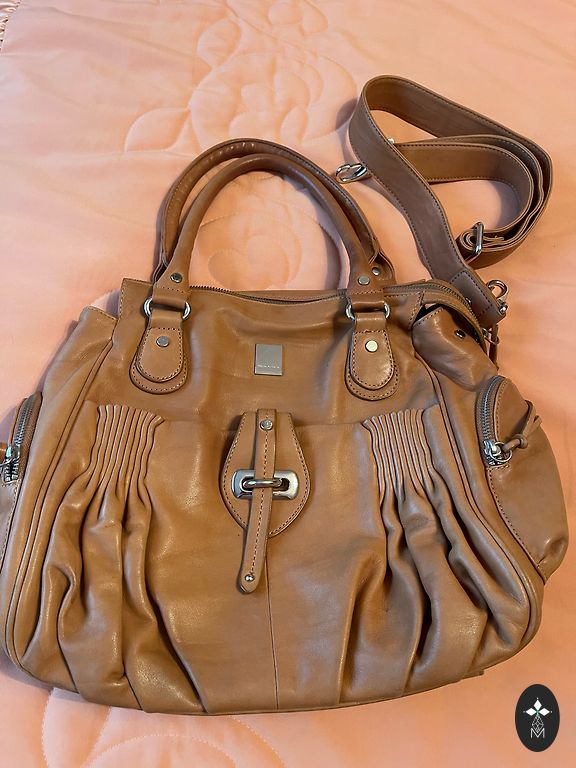 Soma labā stāvoklī, ar dubulto apakšu, nekādu redzamu defektu nav, pirku lietotu internetā, sastāvs bija norādīts dabīgā āda, tā arī uzskatās, pašai somai gan nekādu birku ar sastāvu nav. Somas platums apakšā 31cm, augšā 25cm, augstums 25cm.