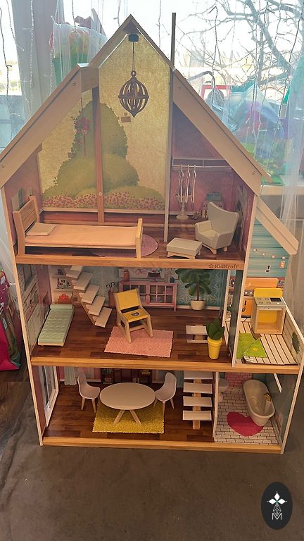Raske ja stabiilne puidust maja koos mööbliga. Ühele toolile tuleb serv tagasi liimida. Saab kenasti üle värvida ja kaunistustega katta, sellist poest enam ei leia. Mõõtmed 62x33.5x53 (katusehari) + 5.5 rõdu. Tütar on suureks kasvanud, aga noorim laps on poiss, seetõttu müün sümboolse summa eest. Asub Jelgavas, pakiautomaati saata ei saa - ainult kulleriga või tuleb ise järele tulla.