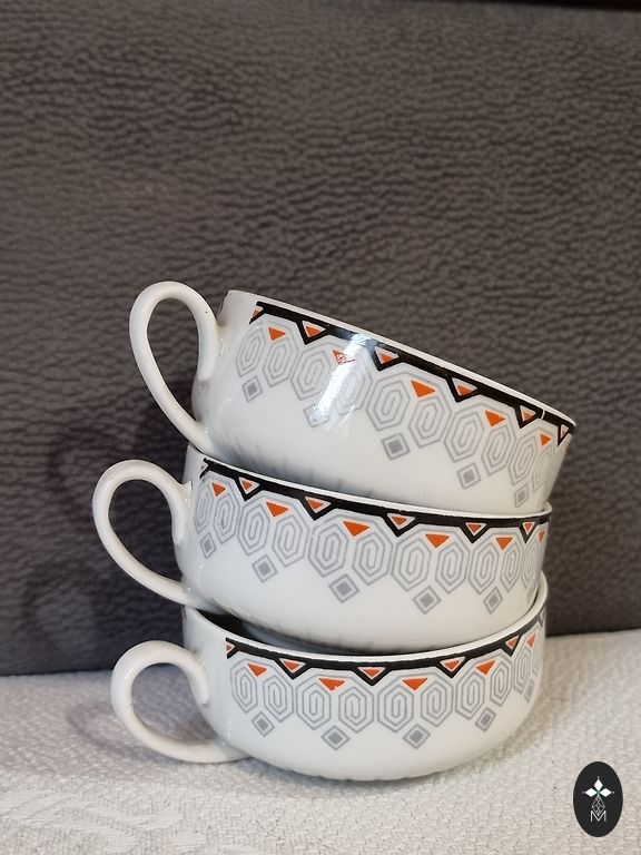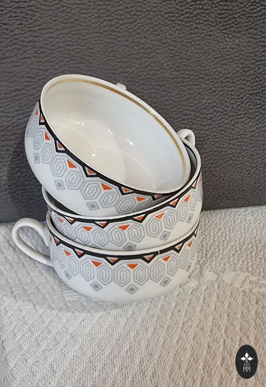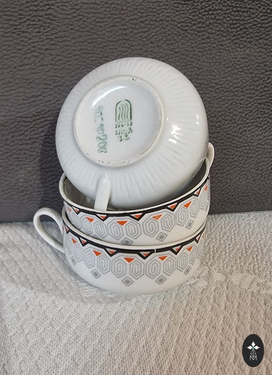 Клеймо указывает на то, что эти изделия были произведены в Метлахе, Германия, в середине XX века (примерно 1950-е – 1970-е годы). Каждый предмет находится в превосходном, сияющем состоянии. Одна из чашек обладает уникальной особенностью — шероховатым участком на ручке. Эта «метка красоты», возникшая в процессе традиционного обжига, подчеркивает аутентичность и полуручной способ производства, добавляя изделию историческую ценность и индивидуальность.