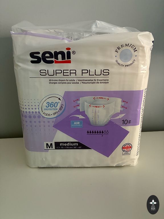 New maternity diapers, size M. 6 pcs of white adhesive ones, with side clips (easy for the beginning when the midwife needs to perform examinations) and 7 pcs of pink pull-up ones like panties.